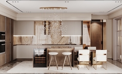 Кухня решена как элегантное и технологичное пространство. Каменные поверхности с выразительным природным рисунком становятся главным декоративным элементом, а лаконичные фасады и встроенная техника сохраняют чистоту линий. Остров с барной зоной работает как функциональный и визуальный центр, объединяя приготовление пищи и общение. Подвесной светильник с прозрачными элементами добавляет интерьеру лёгкости и динамики.